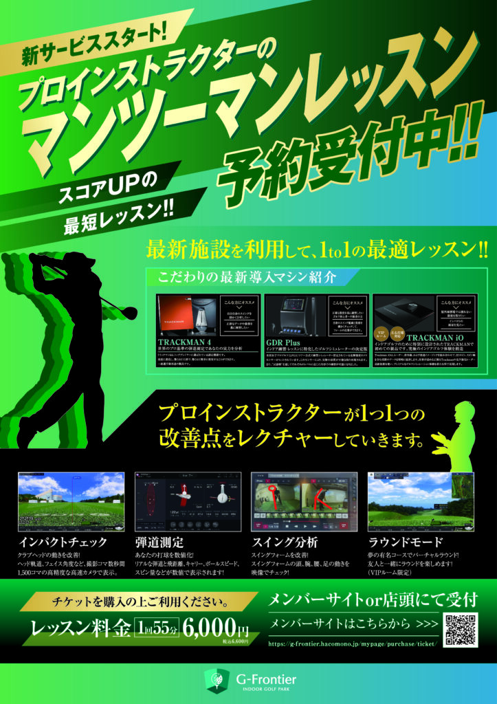 news お知らせ一覧 マンツーマンレッスン受付スタート 2025/9/15 会員様からのご要望を多くいただいておりました、『マンツーマンレッスン』を10月よりスタート致します♪無料ワンポイントレッスンでは消化しきれないことや、じっくり話し合いながら理解を深めたい方にオススメです!初心者レッスンから、スイング改造までプロのコーチがマンツーマンで対応致します!!店頭受付、またはメンバーサイトからご予約をお願いします。